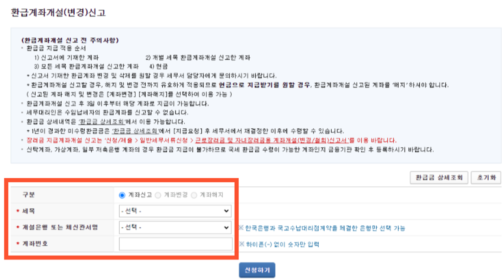 우편이나 팩스로 받으려면 국세청 누리집 홈페이지에서 국세 정보를 클릭, 세무 서식에 들어가 계좌개설(변경) 신고서를 검색합니다. 이를 작성해 우편 또는 팩스로 보내면 확인 후 지급됩니다. 만약 국세환급금 통지서를 받으셨다면 신분증을 준비해 우체국에 방문해서도 수령하실 수 있으니 편한 방식대로 신청해 받아 보시길 바랍니다.