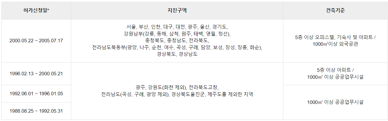 건축법령에 의한 기간별 내진설계적용 대상