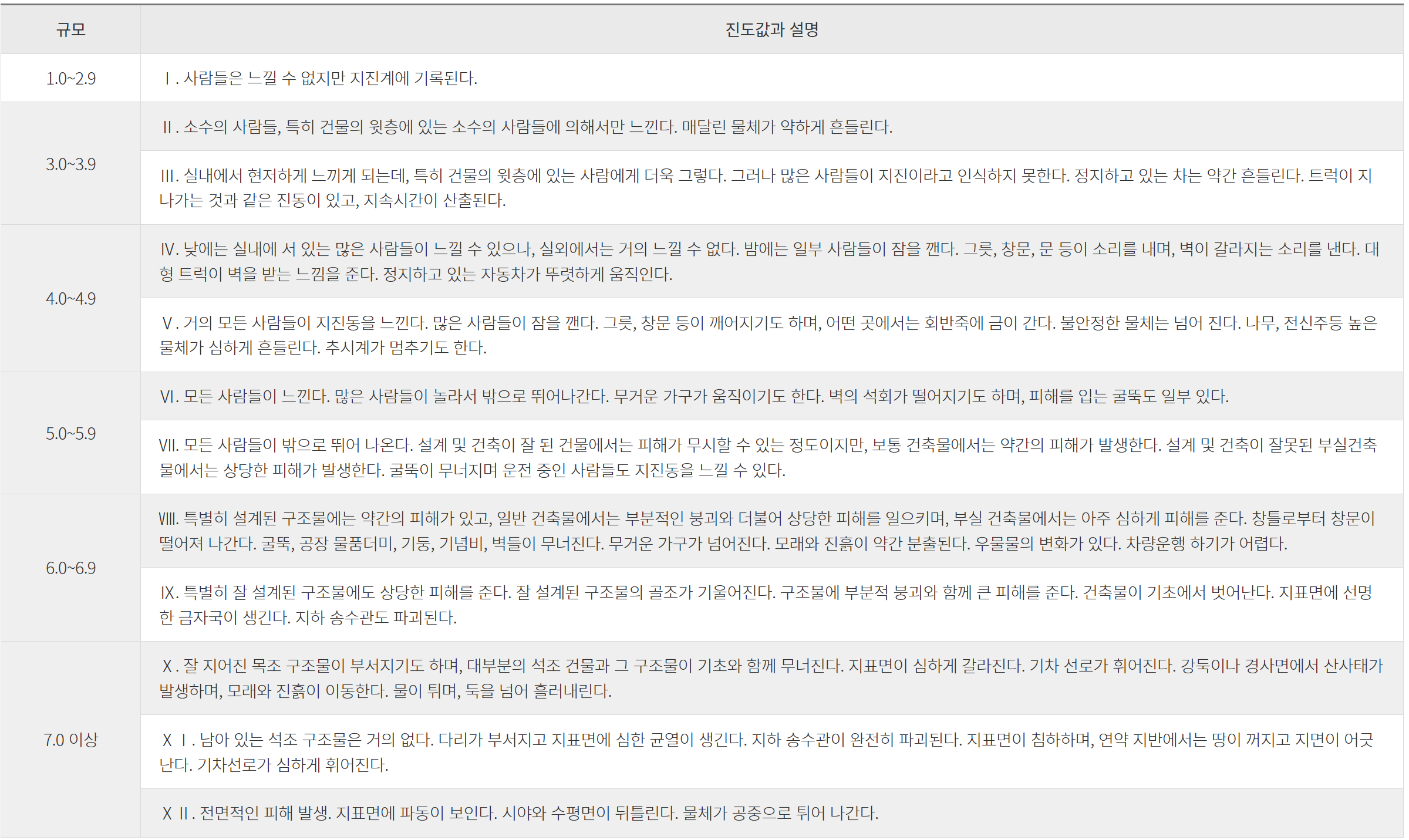보신바와 같이 진도 7.0 이상이면 전면적인 피해가 발생하며 대부분의 석조 건물과 그 구조물이 기초와 함께 무너진다고 하네요. 그래서 튀르키예의 지진 피해가 매우 큰 것 같습니다.