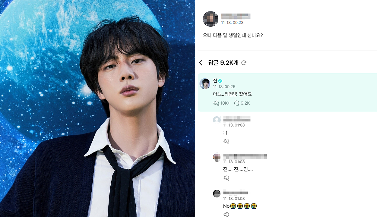 앞서 진은 이달 13일 글로벌 팬 커뮤니티 위버스를 통해 팬들과 문답을 주고 받는 가운데 "다음 달 생일인데 신나요?"라는 한 팬의 질문에 "아뇨. 최전방 떴어요"라고 답했습니다.
