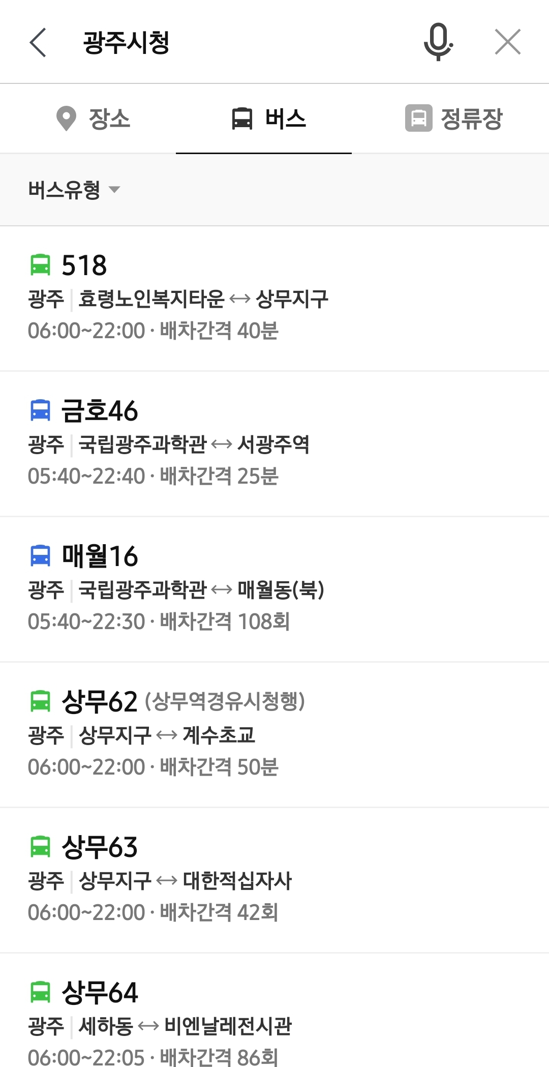 예를 들어 광주지역 버스 노선이 궁금하다면 도착장소를 입력합니다. 현재 위치가 같이 검색되면, 아래에 버스 탑승 시간, 예상 도착시간, 배차간격까지 나옵니다.