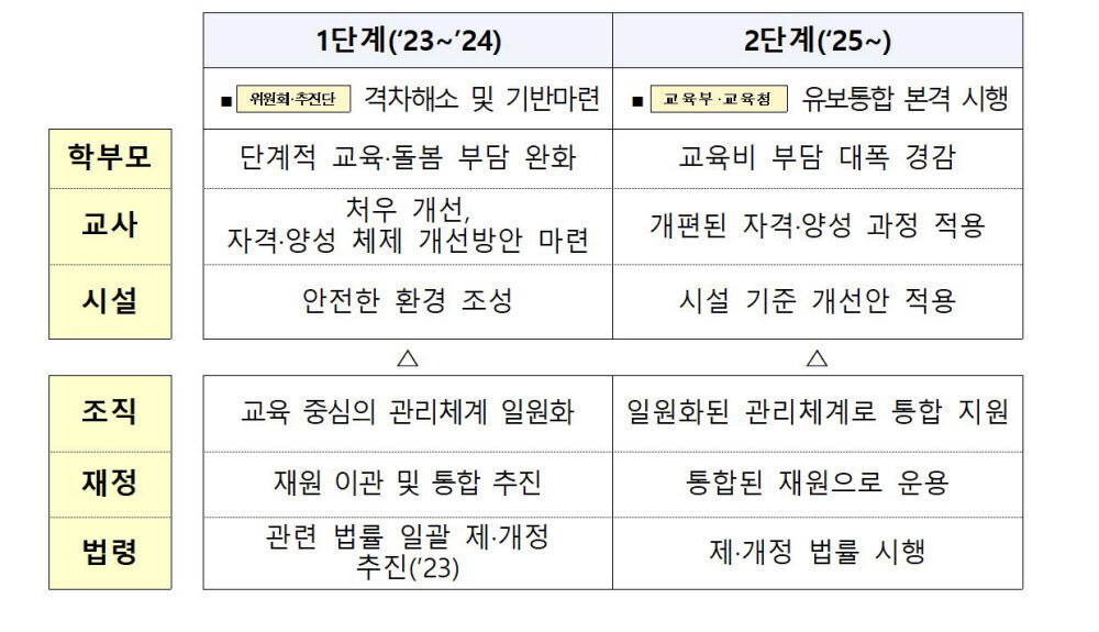 윤석열 정부는 2023년부터 2024년까지 1단계, 2025년부터 2단계로 나눠 유보통합을 추진합니다. 1단계에서는 학부모 부담 격차를 해소하고 교육부와 보건복지부로 나뉜 관리체계도 일원화합니다. 2025년부터는 새로운 교육·보육 기관을 통한 유보통합 2단계가 추진됩니다.