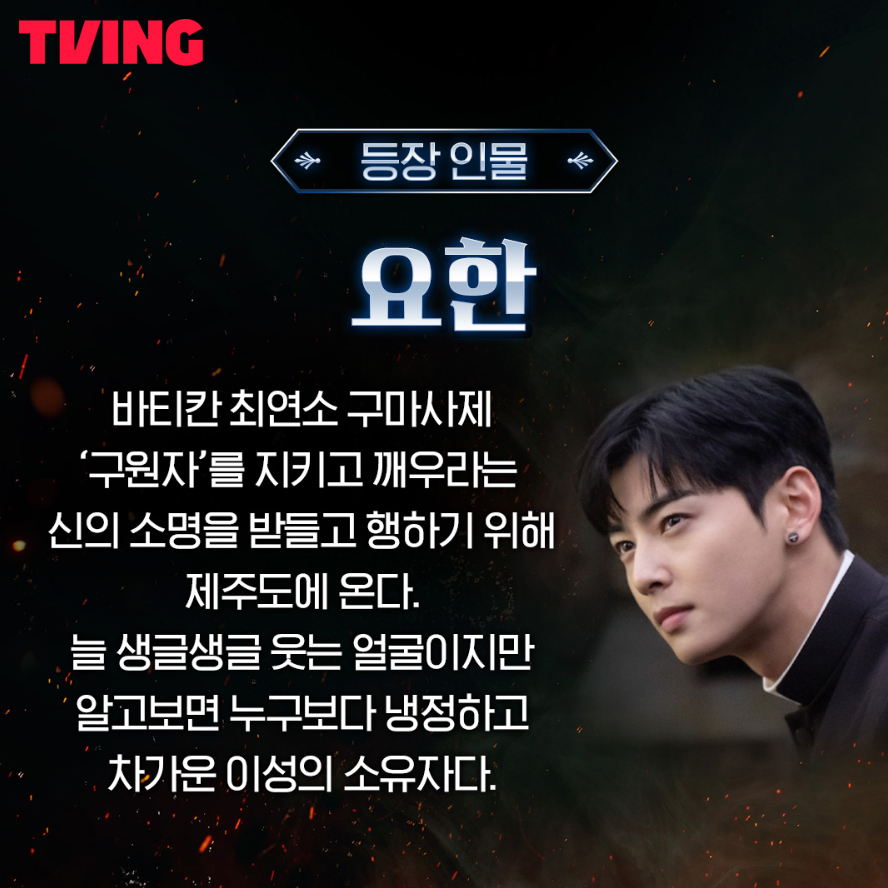 바티칸 최연소 구마사제 '요한'역 차은우는 "요한은 평소 밝고 천진난만하다가도 악에 맞서야 하는 상황에서는 강인한 모습을 보여주는 반전 캐릭터"라고 언급하며 "액션 연기를 통해 지금까지 보여드린 적 없는 새로운 모습을 보여드릴 것"이라 각오를 다졌습니다.