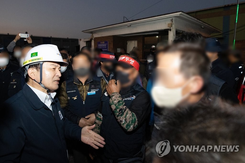 (서울=연합뉴스) 원희룡 국토교통부 장관이 26일 오후 경북 포항 소재 철강 산업단지의 포스코와 철강재 운송업체를 방문해 화물연대 조합원들을 만나고 있다. 국토교통부는 원 장관이 화물연대 조합원들에게 “안전운임제 일몰 연장은 국회에서 처리되도록 할 것이며, 앞으로도 대화는 지속할 것이므로 일단 현업에 복귀하시기 바란다”며 집단운송거부 중단을 촉구했다고 설명했다. 2022.11.26 [국토교통부 제공. 재판매 및 DB 금지] photo@yna.co.kr